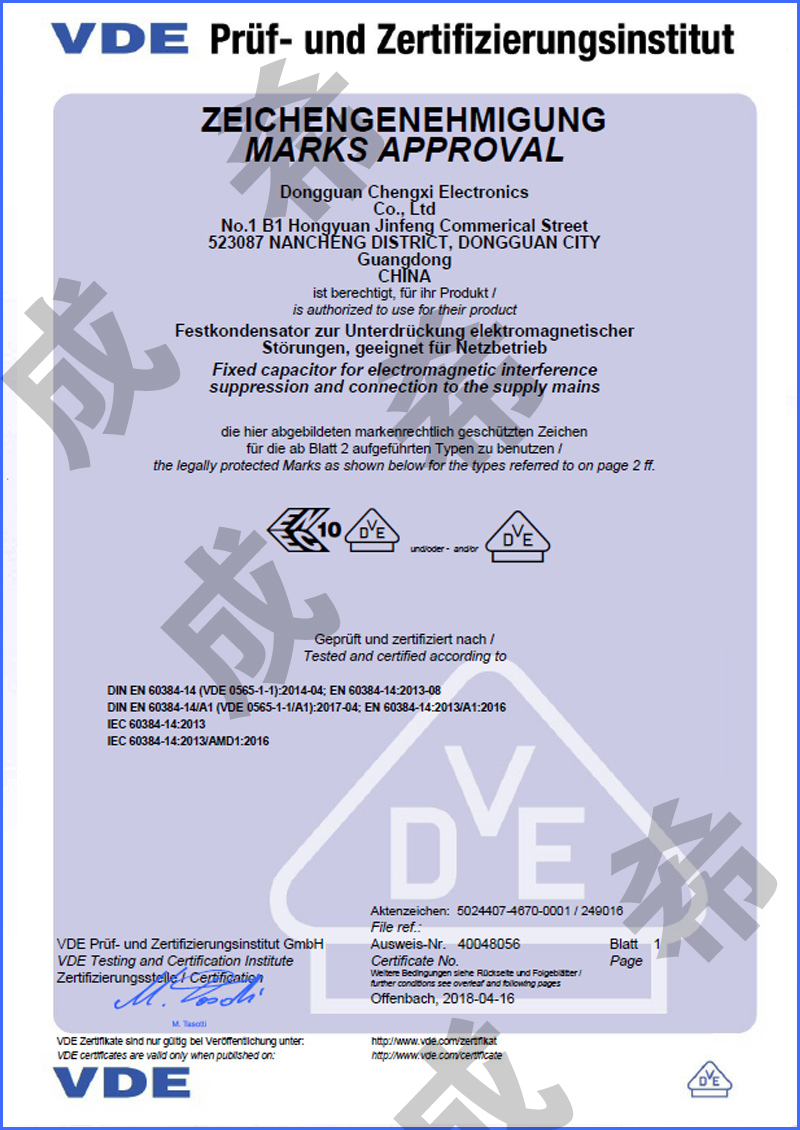 公司通過ISO9001:2015質量管理體系;ISO14001:2015環保管理認證.安規X、Y電容、壓敏電阻通過CQC、UL/CUL、TUV、ENEC等安全認證,產品符合RoHS、REACH、HF環保認證。